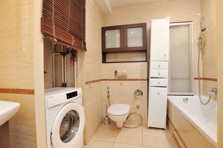 - Łazienka (5m2): wanna z zabudową szklano-aluminiową umożliwiającą jednoczesne korzystanie z prysznica, deszczownica HansGrohe. Pralka automatyczna. Umywalka z lustrem i szafką podumywalkową. WC kompaktowe z prysznicem bidetowym.