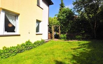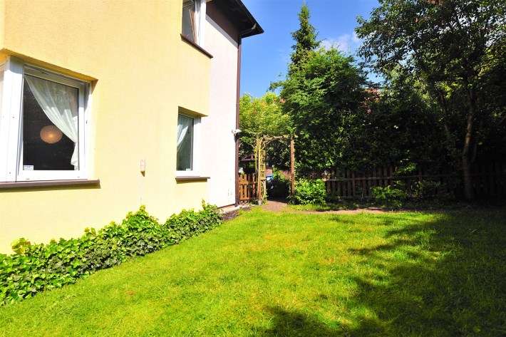 Trawnik, huśtawki dla 2x dzieci, liczne nasadzenia roślin, krzewy i drzewa owocowe, żywopłot, mini ogródek warzywny. Całość w pełni zagospodarowane. Ponadto w ogrodzie drewutnia z oświetleniem z przeznaczeniem na rowery, kosiarkę do trawy i grilla.