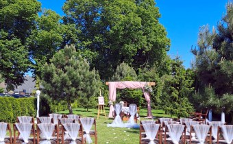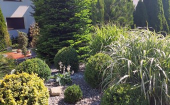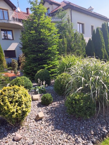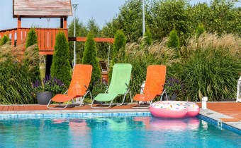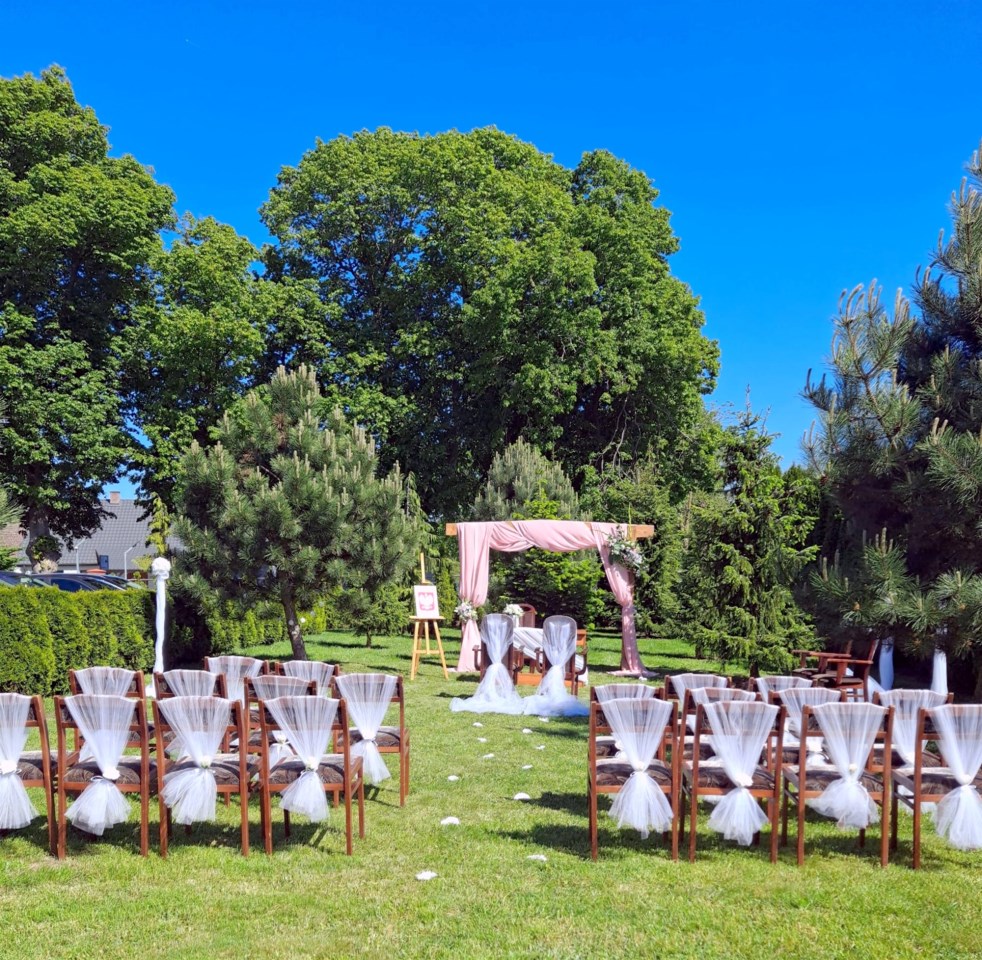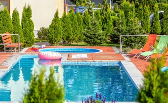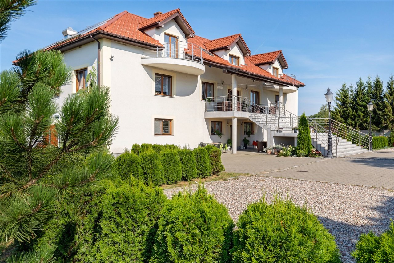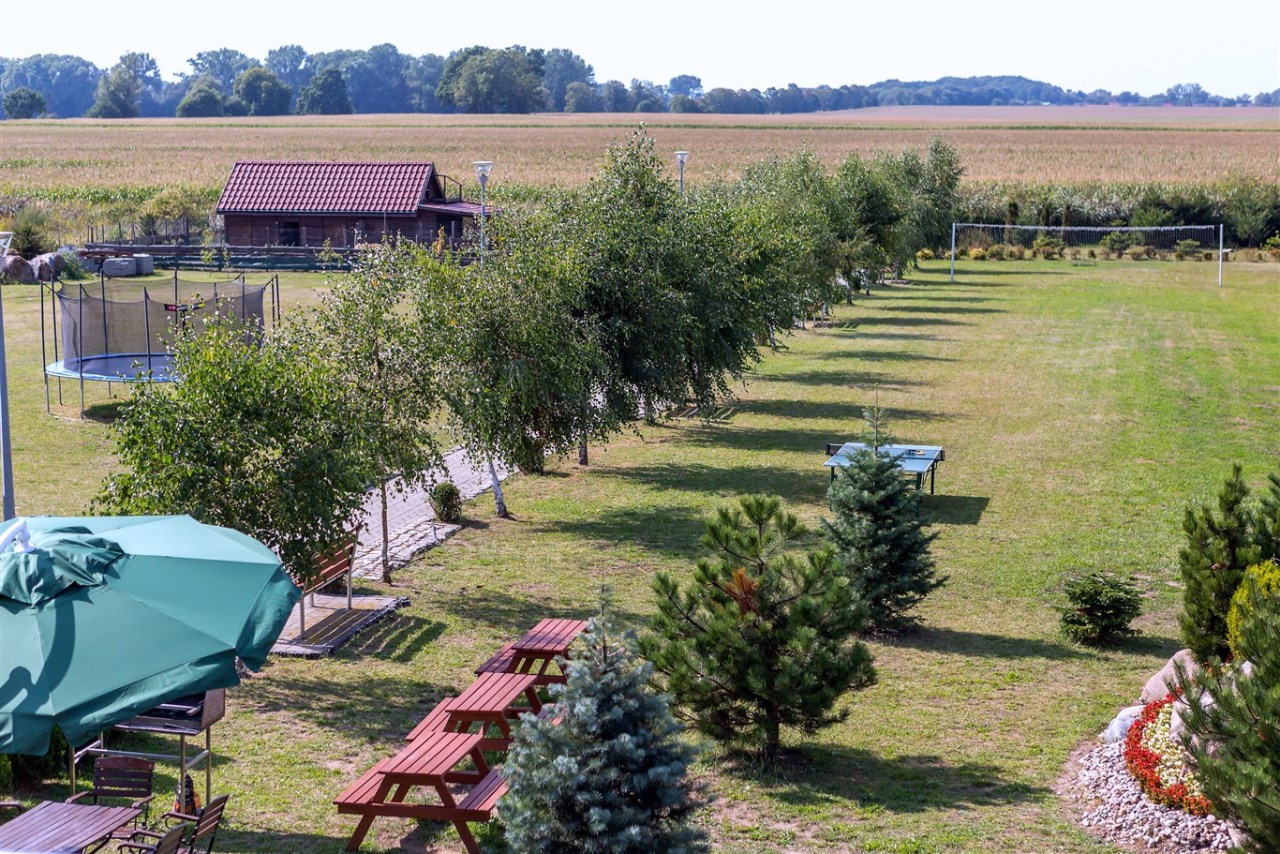 Na terenie posesji znajduje się podgrzewany basen, jacuzzi, miejsce na ognisko i grill, plac zabaw z boiskiem, zjeżdżalnią i huśtawkami, a także parking na 28 pojazdów. Całość otoczona jest licznymi nasadzeniami, alejkami i ścieżkami z kostki brukowej.