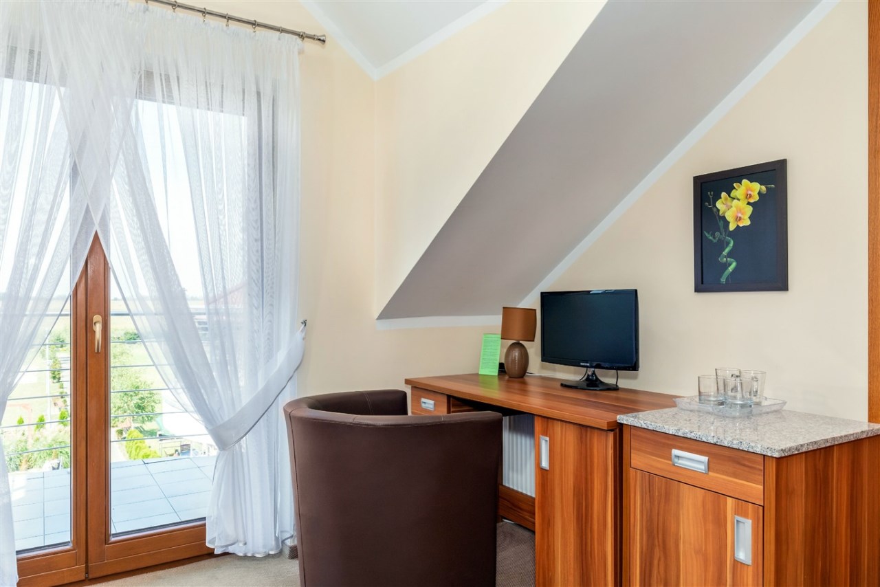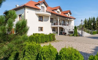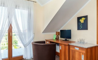 Na piętrze i poddaszu zlokalizowana jest część pensjonatowa z pokojami gościnnymi w nowoczesnym stylu. Dodatkowo, dla kadry zarządzającej przewidziano niezależny apartament o powierzchni ok. 90 m² z przestronnym salonem, kuchnią, sypialnią, łazienką, garderobą oraz tarasem.