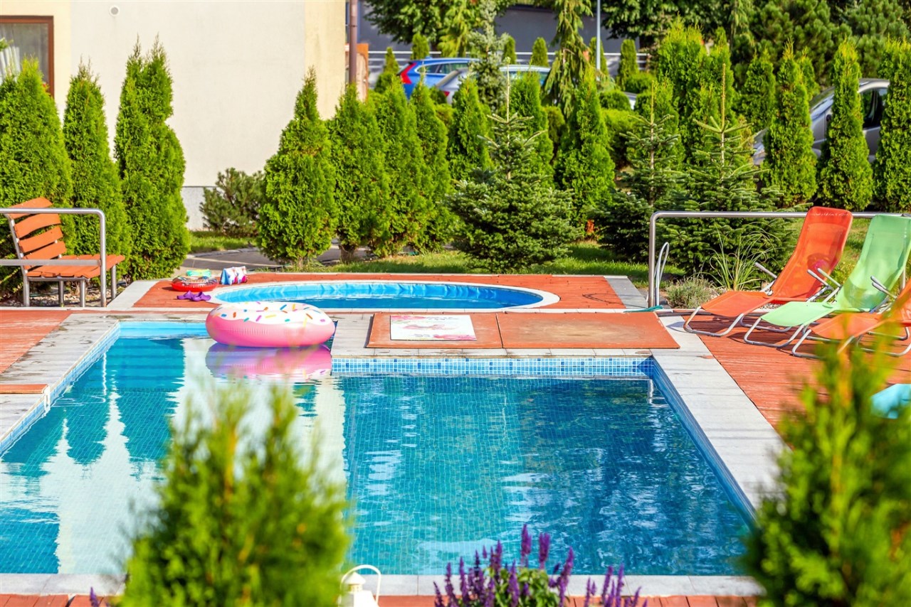 The grounds feature a heated outdoor swimming pool, jacuzzi, barbecue and bonfire area, children’s playground with a sports field, slide, and swings, as well as a paved parking lot for 28 vehicles. The entire area is surrounded by greenery, decorative plantings, and walking paths.